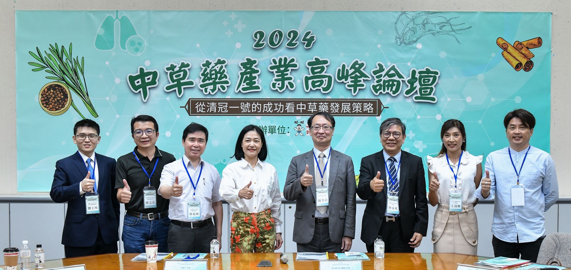 工商時報主辦「2024中草藥產業高峰論壇」23日舉行,資誠聯合會計師事務所生醫產業服務副總劉士瑋(左起)、陽明交通大學生物科技學系副系主任陳文亮、台灣大學生物資源暨農學院長林裕彬、台經社長孫智麗、衛福部中醫藥司長蘇奕彰、中醫師公會全聯會理事長詹永兆、王大夫一條根營運長王凌卿及總座王建順與會。圖/王德為